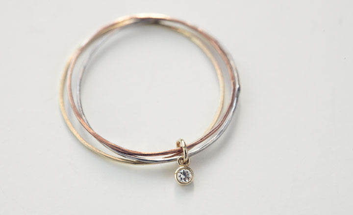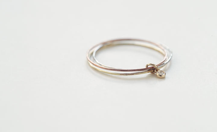What to know: Handmade in Los Angeles; rings in solid 14-karat rose gold, white gold, and yellow gold; trio is connected by a yellow gold jump ring with a bezel-set 1.5 point white diamond.