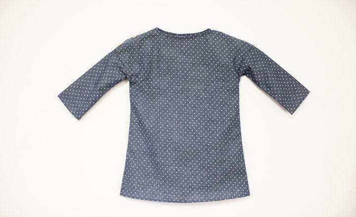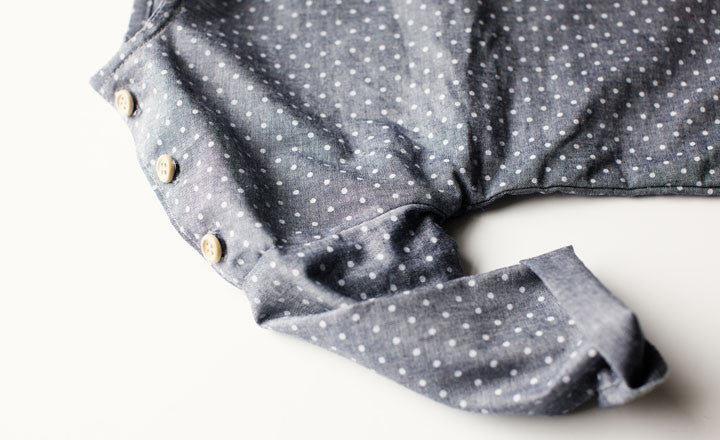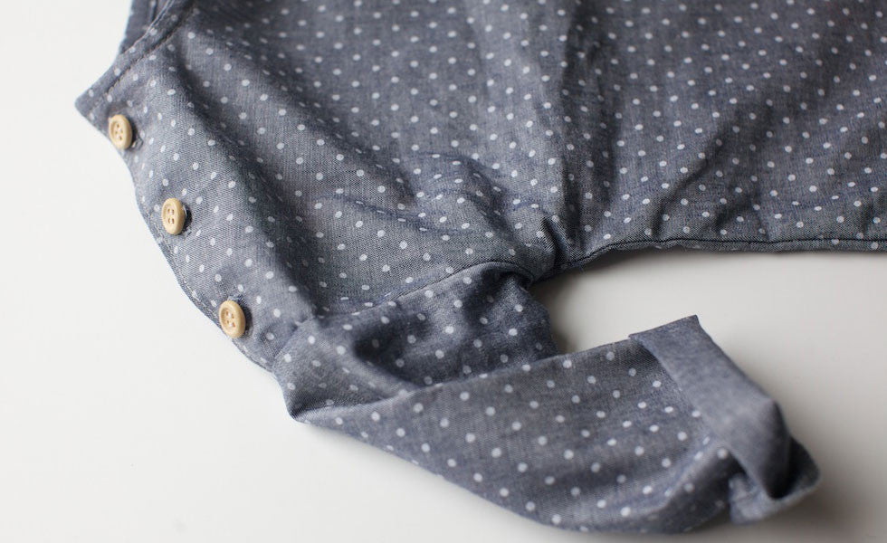 What to know: Made in Utah; 100% cotton printed chambray from Japan with wood buttons made in America; 12 months measures 15 1/8 inches shoulder to hem and 11 3/8 inches across chest; 18 months measures 17 5/8 inches shoulder to hem and 12 inches across chest; 2-3 years measures 19 3/4 inches shoulder to hem and 12 3/4 inches across chest; 4-5 years measures 22 1/4 inches shoulder to hem and 13 1/2 inches across chest.