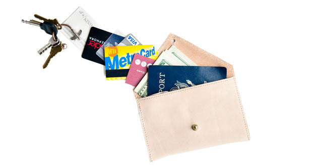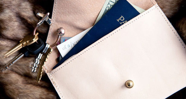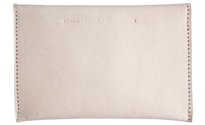 What to know: 6.5 inches wide by 4.25 inches tall, nude leather, one credit card-size interior pocket.