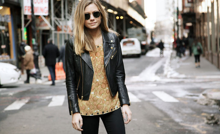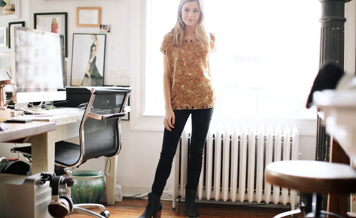 We're ginormous fans of Rachel Rose's hand-painted tees, and though we heart some popsicle hues, sometimes you want to just keep things neutral. This camel, black, and white take goes with, well, everything—toss it under a blazer or throw it on with some slim black pants. And, if you're tempted to spice things up, how's about a bright red or blue clutch?