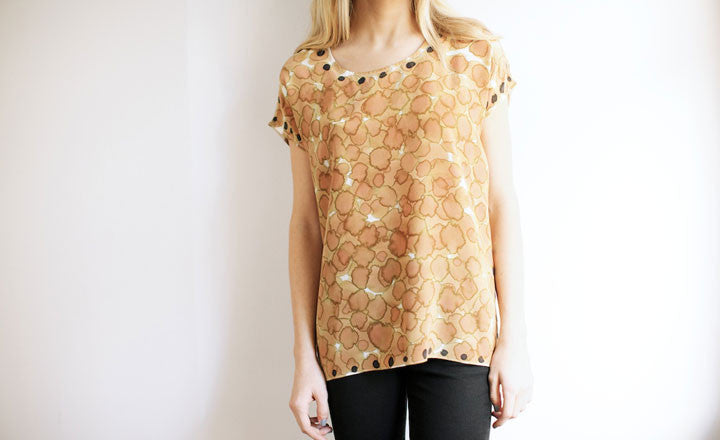 What to know: Made in NYC and hand-painted in Brooklyn; 100% silk crepe de chine; one size fits many; measures 25 inches from shoulder to hem and 19 ½ inches across the chest with 6 ½-inch-long armholes.