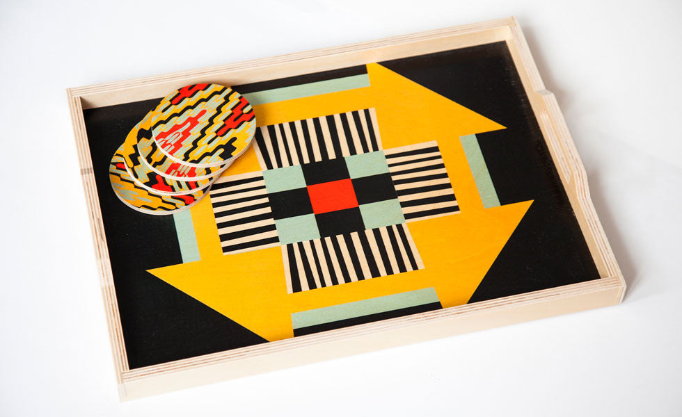 What to know: Made in Los Angeles; FSC-certified Baltic birch with custom print; tray measures 19 by 14 by two inches; each of 4 coasters measure 4 by 4 inches and are ¼ inch thick.