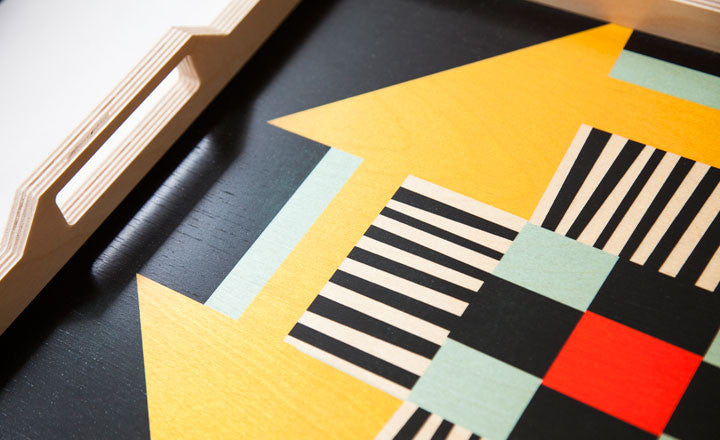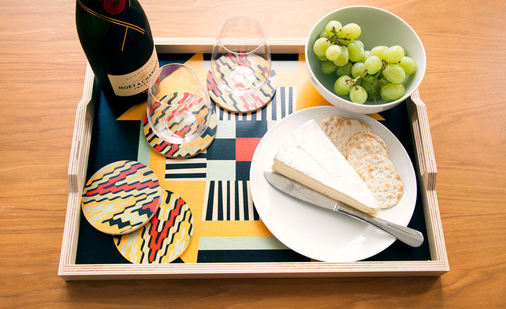 Thanks to the mix of primary colors and the rad geometric patterns, this way-cool wooden set pops on pretty much any surface. Which means you can use the tray to hold pre-dinner drinks and snacks, the pile of books that are currently scattered across your coffee table, or your mail. Yes, it even makes your electricity bill look prettier.
