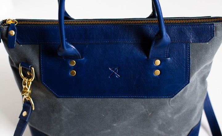What to know: Made in NYC; water-resistant charcoal waxed canvas with navy calfskin leather, solid brass hardware, and navy twill cotton lining; measures 14 by 10 by 5 inches; 5-inch handle drop; 40-inch-long strap; inner slip pocket measures 5 ½ by 3 ½ inches; inner zip pocket measures 7 by 5 inches.