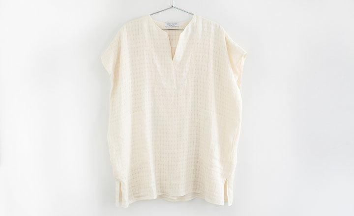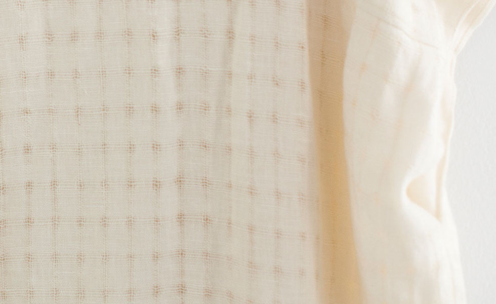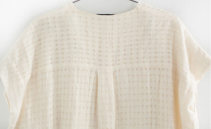 What to know: Made in NYC; 100% tonal plaid linen lined with 100% washed cotton; Extra-Small/Small measures 33 inches from shoulder to hem and 27 inches across the bust, waist, and hips; Medium/Large measures 33 inches from shoulder to hem and 28 inches across the bust, waist, and hips; two side pockets measure 7 ¾ by 9 ¼ inches; both models are 5 feet 10 inches tall.
