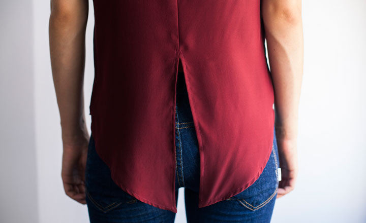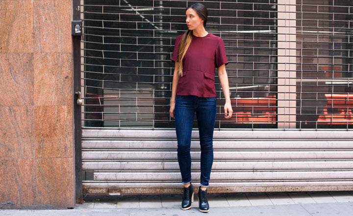This oxblood silk number is so freaking ladylike. With its structured cut and flap pockets, it could hang with a pencil skirt and patent pumps, but we think it looks especially fly with a pair of skinnies. And we love the idea of those ridiculously charming, tux-style tails hanging out the back of a cropped bomber jacket.