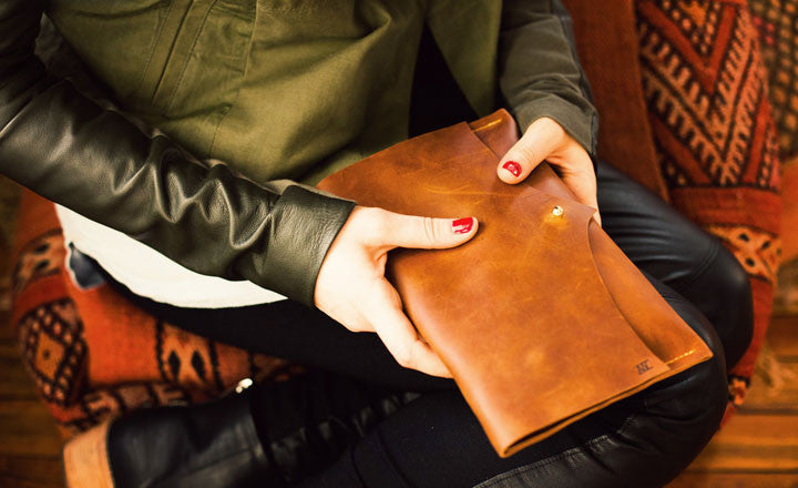 What to know: Made in Nashville; cognac and gray leather sourced in Watertown, Tennessee, obtained from closed-down leather and shoe factories; brass closure; measures 9 ¼ by 5 ¾ inches.