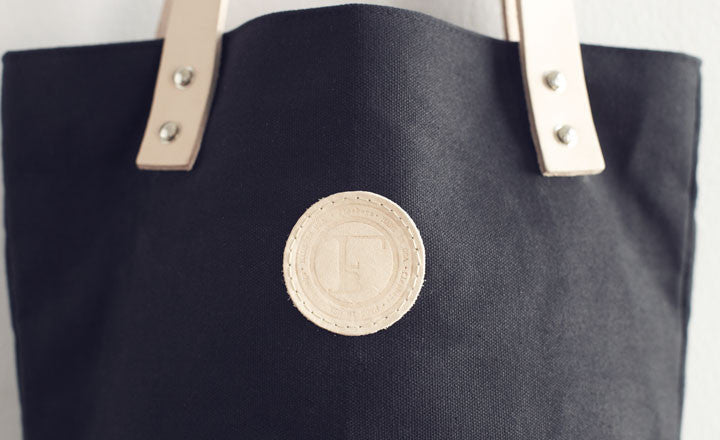 What to know: Made in America; black canvas and tumbled black leather with blush vegetable-tanned leather handles and embossed patch and nickel hardware; measures 15 by 14 inches with 24-inch-long straps and 7 by 9 inch interior drop pocket; handles are unfinished and will develop a patina over time.