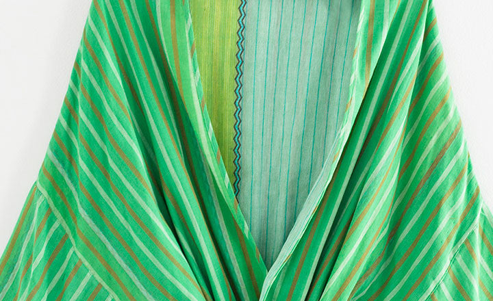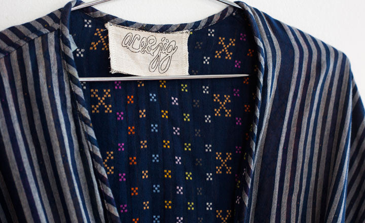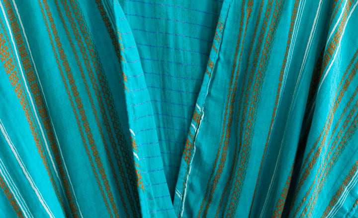 What to know: Made in India; Green, Navy, and Turquoise robes are 100% cotton; Cream robe is 96% cotton, 4% metallic thread; all fabric woven on wooden looms from custom-dyed yarn; measures 35 ½ inches from shoulder to hem, 31 ½ inches across the chest, and 15 inches across the shoulders; sleeves measure 14 ¾  inches from the neck; belt measures 72 inches long.