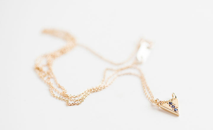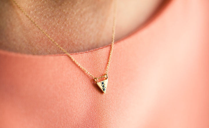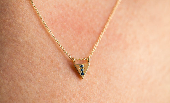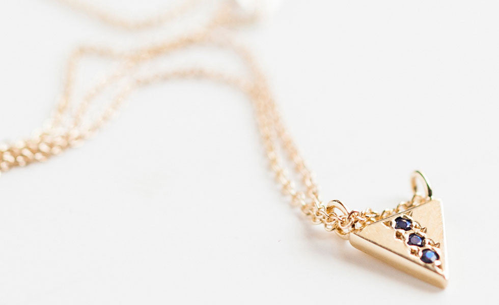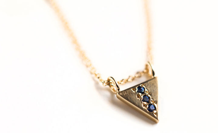 What to know: Handmade in NYC; 10-karat gold chain and 10-karat recycled gold triangle with three tiny (1 mm) blue sapphires; necklace measures 16 inches long; pendant measures ¼ inches from base to tip.