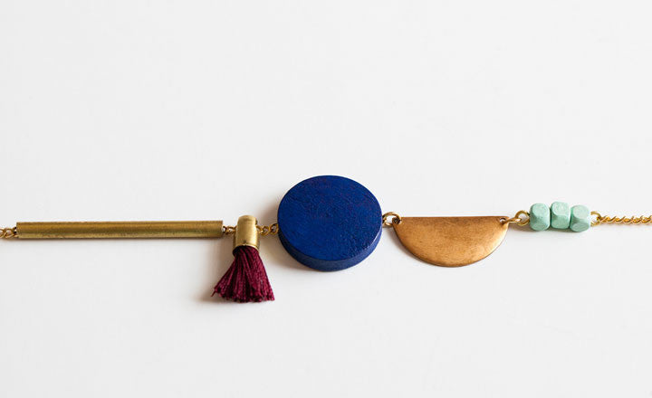 What to know: Handmade in Chicago; brass beads, seafoam and dark blue wood beads, and cranberry cotton tassel on a gold-plated brass chain; chain measures 24 inches.