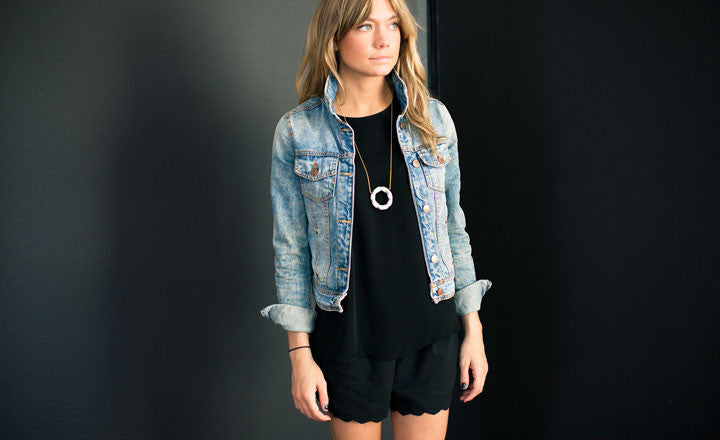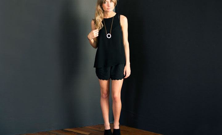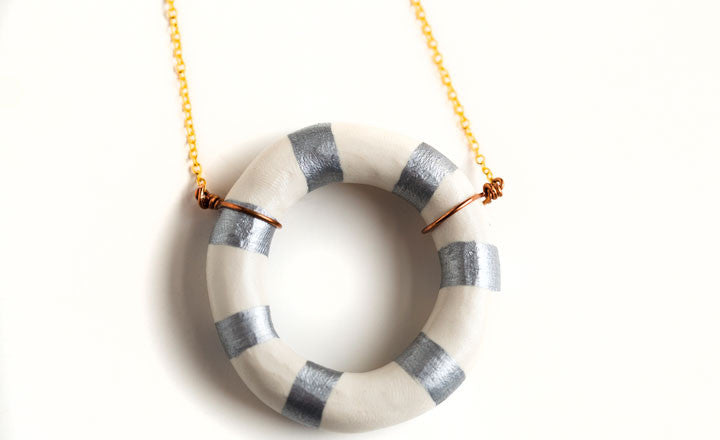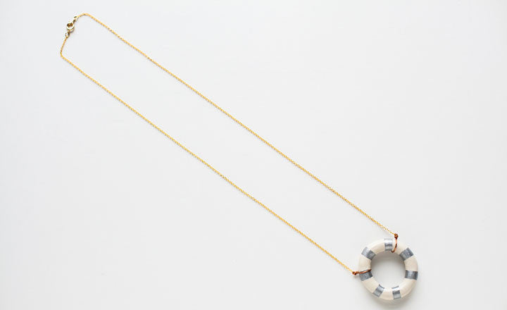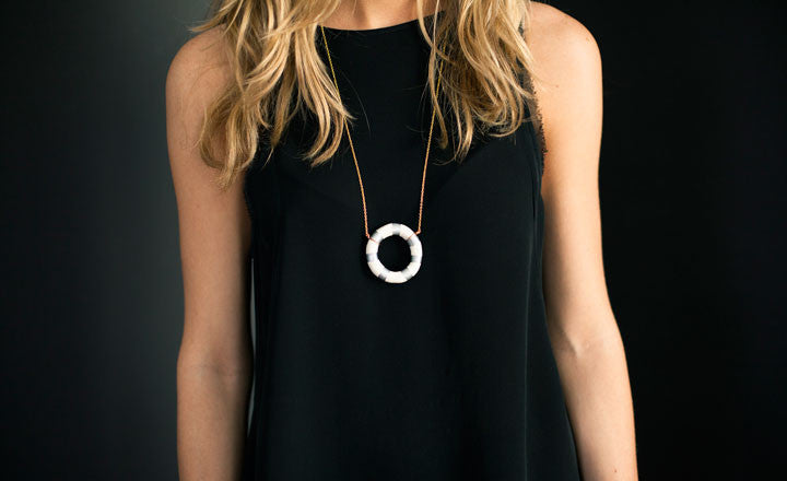 It's pretty amazing how such simple components—a clay circle, some silver stripes, a thin gold chain—can look so altogether fresh. This necklace pops against black bigtime, but it would also kill with a floaty linen summer dress. And maybe metallic sandals?
