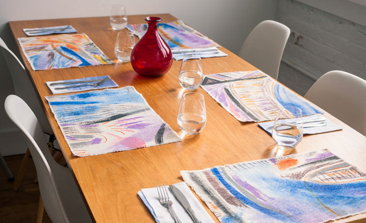 What to know: Handmade in Brooklyn; 6 hand-painted raw canvas placemats with 6 dip-dyed cotton napkins; placemats measure 12 ½ inches by 17 ½ inches; napkins measure 18 inches by 18 inches; colors and patterns vary due to the handmade nature.