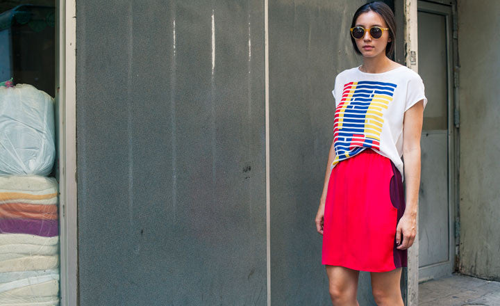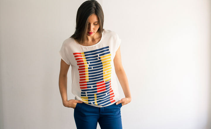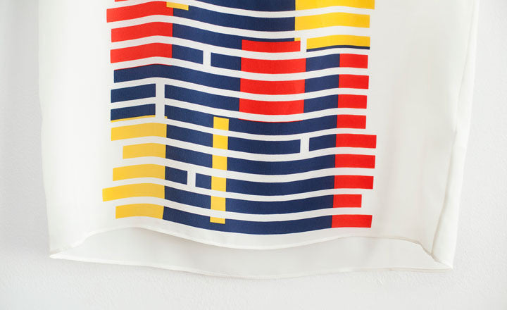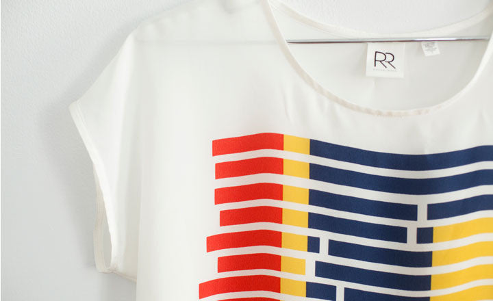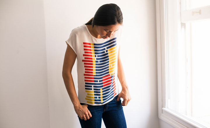 What to know: Handmade in NYC; 100% silk screen-printed with red, yellow, and blue stripe motif; Small measures 19 ½ inches across the chest and 24 ½ inches from shoulder to hem; Medium measures 21 ½ inches across the chest and 25 ½ inches from shoulder to hem; Large measures 23 inches across the chest and 26 inches from shoulder to hem.